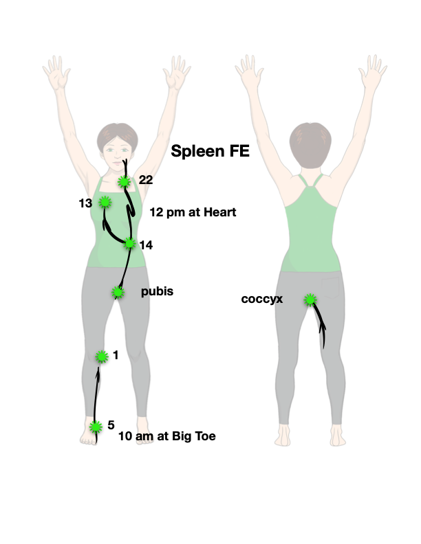 There are at least three variations of the Spleen flow you can choose from, depending on your preference. Place one hand on the coccyx, while the other hand goes to (a) SEL 5, (b) SEL 1, or (c) the pubic bone. Needless to say, when I’m in the throes of digestive agony, I usually go with (c)—as I’m too weak or in too much pain to reach for my feet or knees.