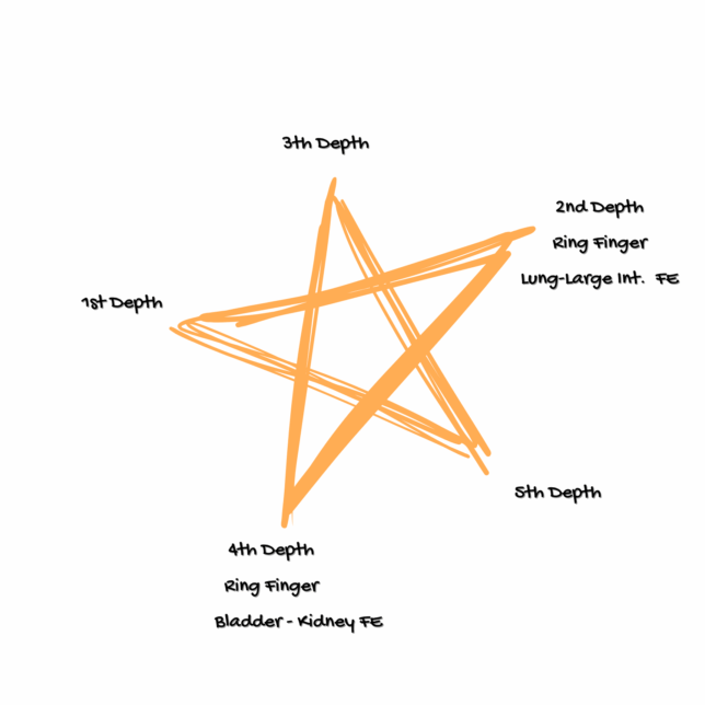Later on, however, if things have developed, there must have been underlying disharmonies, and they will most likely come from the 4th Depth, which overloads the 2nd Depth. Holding the index finger, keeping Kidney and Bladder FE in harmony, is probably helping with that overload.