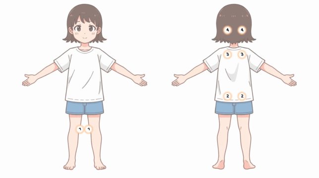 - (right) Place the right hand on the right hipbone (SEL 2) and the left hand on the right SEL 6.
