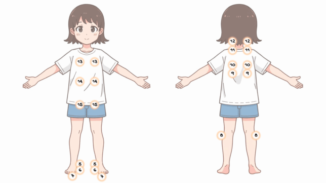 - Left Side: Place the left hand on the left SEL 6 and the right hand on the left little toe.