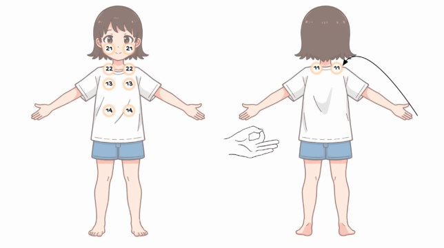 - Place right hand on the right shoulder R11 while left thumb over the left index finger. Reverse for the right flow: Left hand on left shoulder L11 and right thumb over the right index finger (see note below)